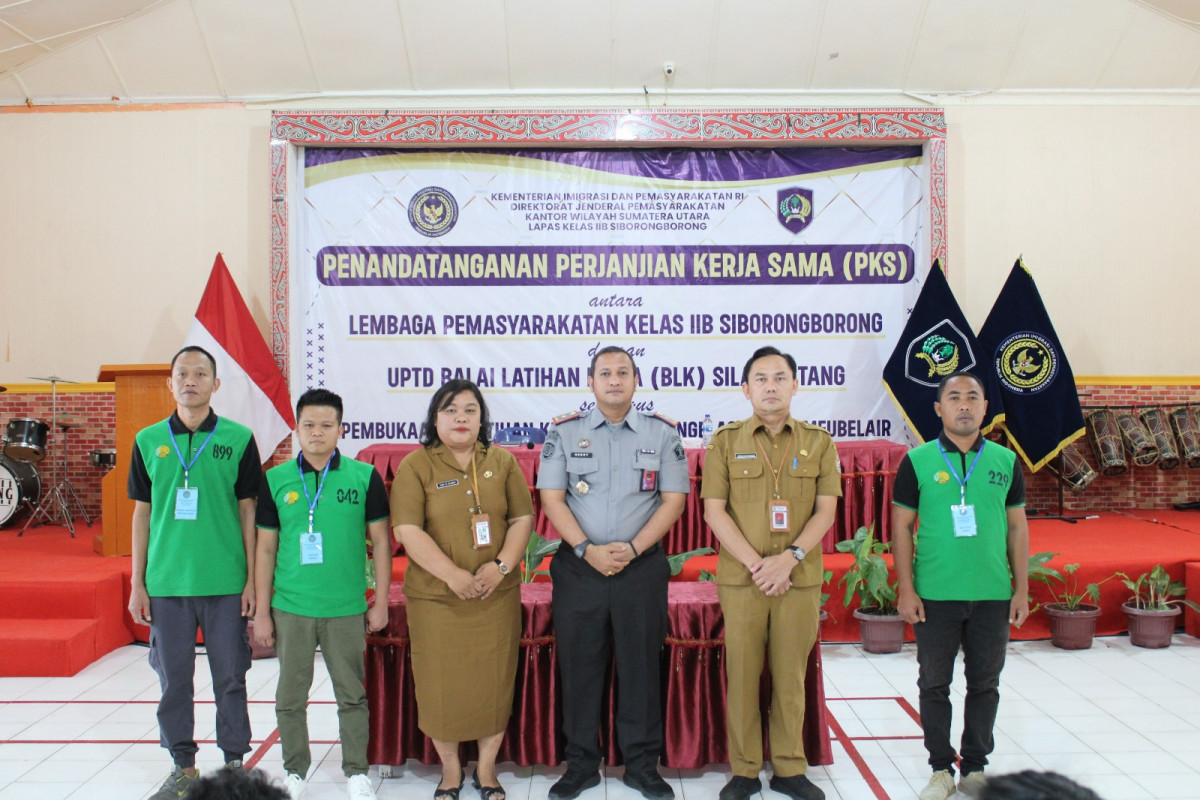 Penandatanganan perjanjian kerjasama antara Kalapas kelas IIB Siborong- borong dengan Kepala Unit Pelaksana Teknis Daerah Balai Latihan Kerja Silangkitang sekaligus Pembukàan pelatihan ketrampilan pengelasan dan Meubilair dilaksanakan di  Aula Lapas kelas IIB  Siborong-borong, Senin 7/7/2025.