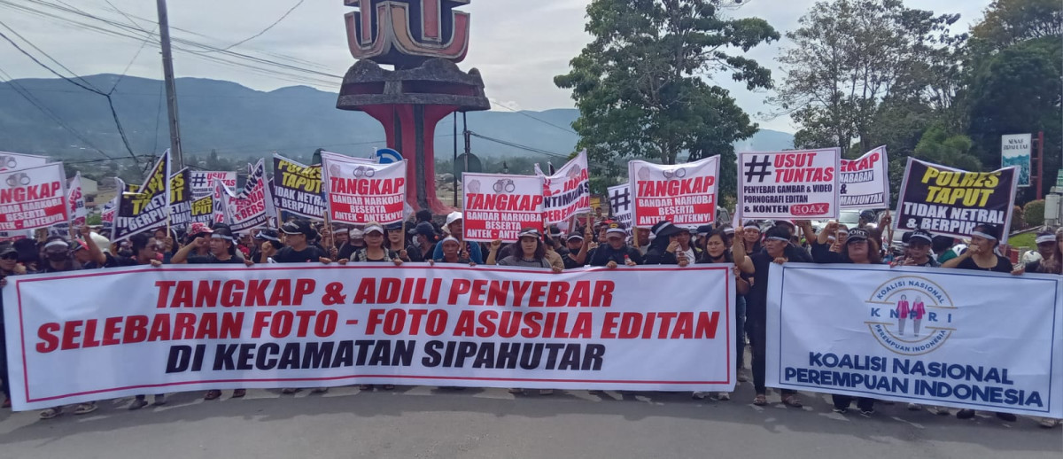 TAPUT || DK – Ratusan Perempuan Tapanuli Utara berdemo ke Polres Taput didampingi Kuali Si Nasional Perempuan Indonesia (KNPRI) dengan membawa spanduk yang bertuliskan ” Tangkap dan Adili Penyebaran Selebaran Foto-Foto Asusila Editan di kecamatan Sipahutar” dan juga menyampaikan Orasi Demo secara bergantian 5 orang, salah satu diantaranya Ezra Hutabarat.