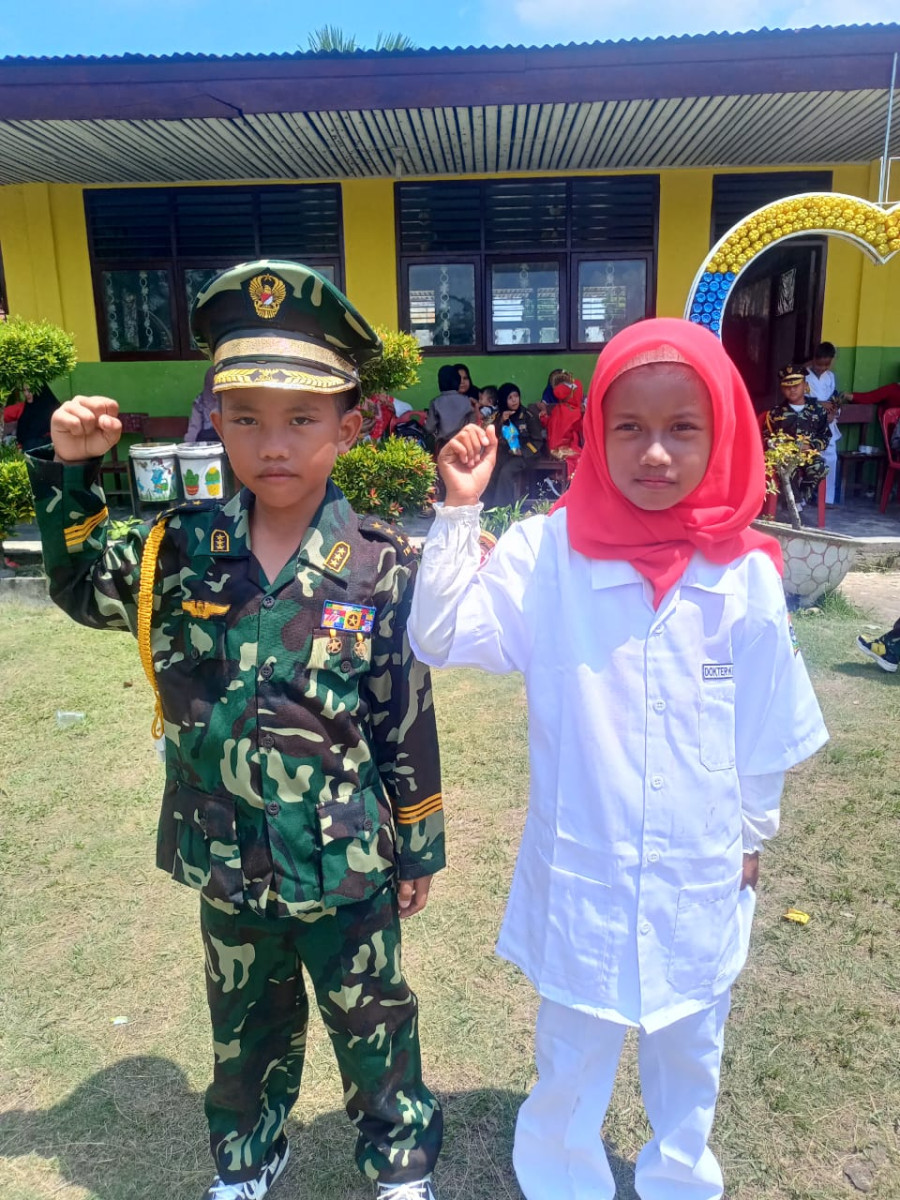 Di antara para peserta pawai, dua siswa, Rasty dan Farel, mencuri perhatian. Rasty yang duduk di kelas 3, mengenakan seragam dokter, sementara Farel yang merupakan siswa kelas 2 tampil gagah dalam seragam Tentara Nasional Indonesia (TNI). Keduanya adalah cucu dari Bolang/kakek Lingga, seorang warga Cempedak Rahuk yang turut hadir untuk menyaksikan pawai ini.
