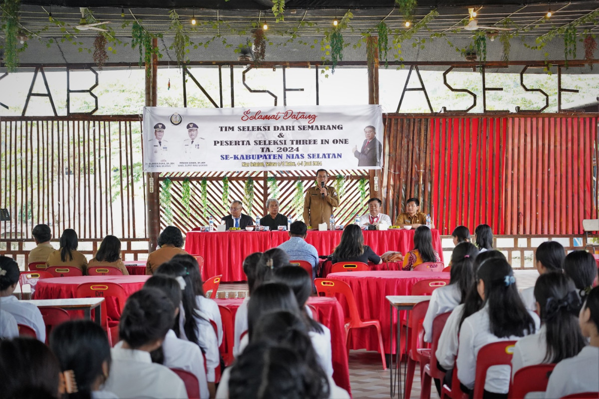 Nias Selatan || DK Pemerintah Kabupaten (Pemkab) Nias Selatan (Nisel) melalui Dinas Ketenagakerjaan dan Koperasi Usaha Kecil Menengah (DKKUKM) melangsungkan giat seleksi calon peserta program three in one (berlatih, bekerja dan kuliah dalam satu paket) Tahun 2024 yang berlangsung selama 2 hari dari tanggal 4 sampai dengan 5 Juni 2024 bertempat di Hall Wallo Green Teluk Dalam, Selasa (04/06/2024).