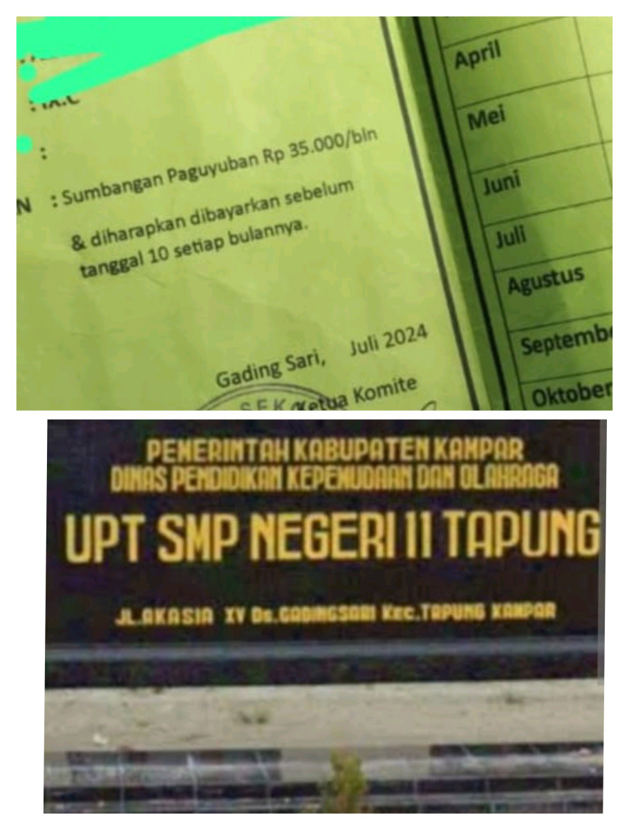 Kampar || DK – Tapung Desa Gading Sari , Senin tanggal 17 Maret 2025, mendapat informasi dari masyarakat dan salah satu wali murid bahwa ada nya pengutipan di SMP Negeri 11 Tapung , dengan dalih uang paguyuban sebesar Rp 35000 Rupiah per siswa , kami dari media langsung melakukan pengecekan kebenaran berita tersebut.