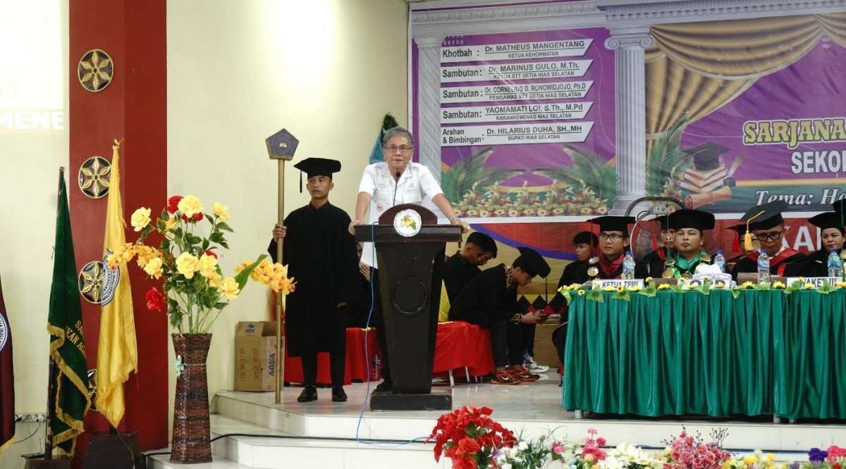Nias Selatan, detakkeadilan.com. Bupati Nias Selatan (Nisel) Dr. Hilarius Duha, SH.,MH menghadiri acara Wisuda Sekolah Tinggi Teologi Injili Arastamar (SETIA) Nias Selatan yang ke – XII Tahun 2024 dengan Tema : Hamba Yang Taat di Tengah Dunia (Titus. 2 : 9-10), yang dilaksanakan di Balai Pertemuan BKPN Teluk dalam – Nias Selatan, Jumat (21/06/2024).
