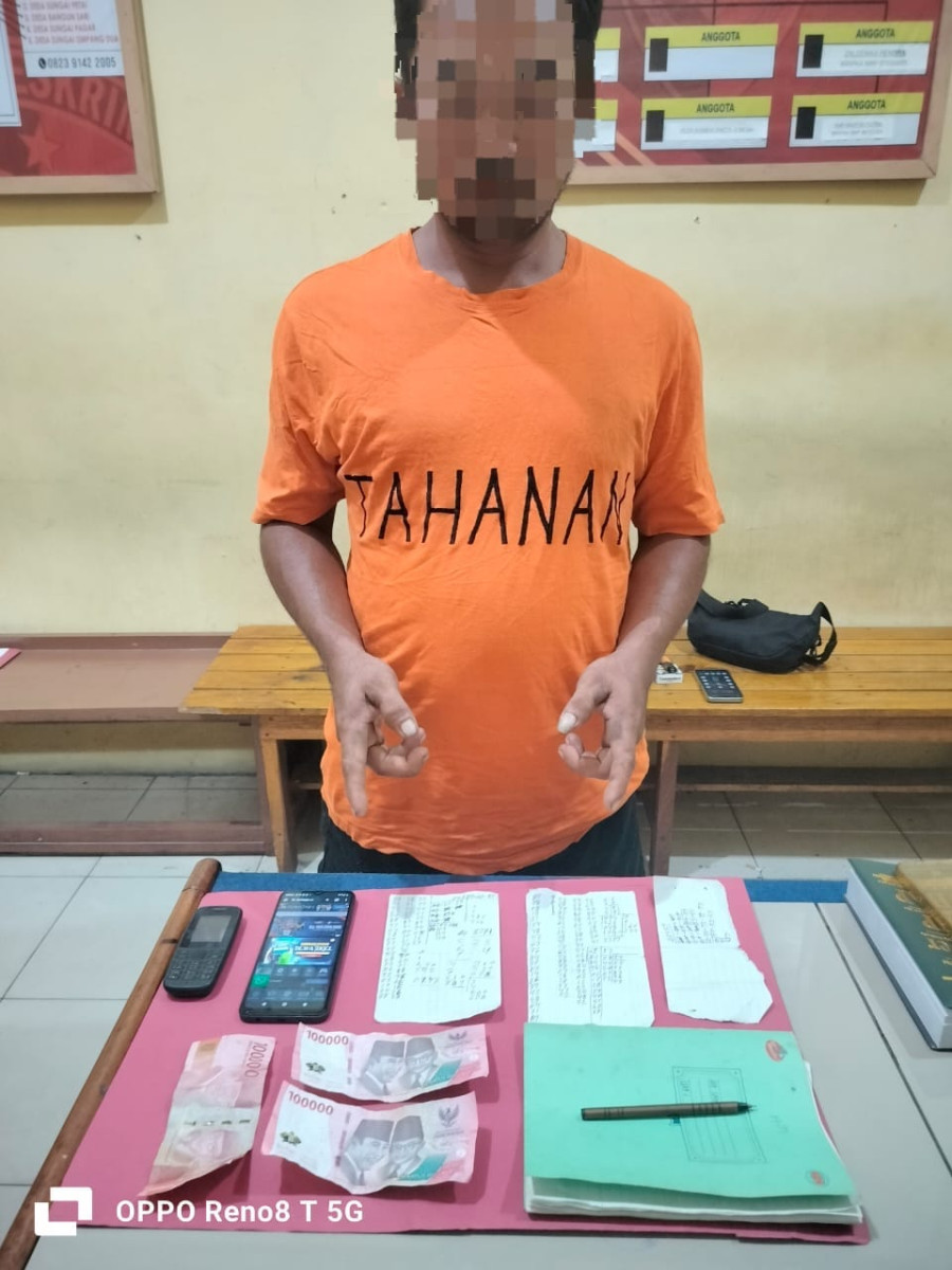 Barang bukti yang berhasil diamankan, uang tunai sejumlah Rp. 300.000 (tiga ratus ribu rupiah) 1 (satu) Buah HP merk Realme c30s warna hitam, 1 (satu) Buah HP merk Nokia warna hitam, 1 (satu) Buah Buku warna hijau, 3 (lembar) lembar kertas, 1 (satu) Buah pena warna coklat