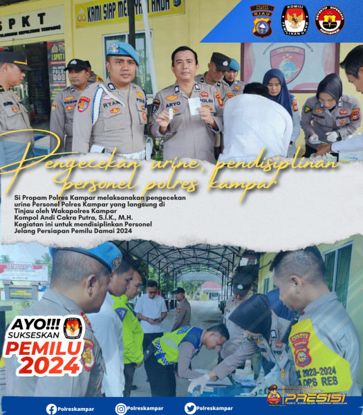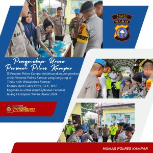 Kapolres Kampar AKBP Ronald Sumaja SH, SIK melalui Waka Polres KOMPOL ANDI CAKRA, S.I.K.,M.H. menyampaikan “Adapun Tes tersebut dilakukan secara mendadak sebanyak 20 orang dengan Alat yg di gunakan AMPHETAMINE merek Righsing dengan pengecekan sikap tampang, kelengkapan indentitas personil, dan pengecekan urine”.