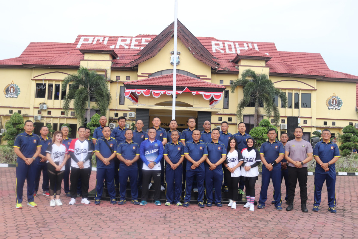 Olahraga senam bersama Personel Polres Rokan Hilir, dihadiri Kapolres Rokan Hilir, AKBP Isa Imam Syahroni SIK MH, Wakapolres Kompol Ricky Michael Mandey SIK MH,