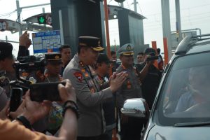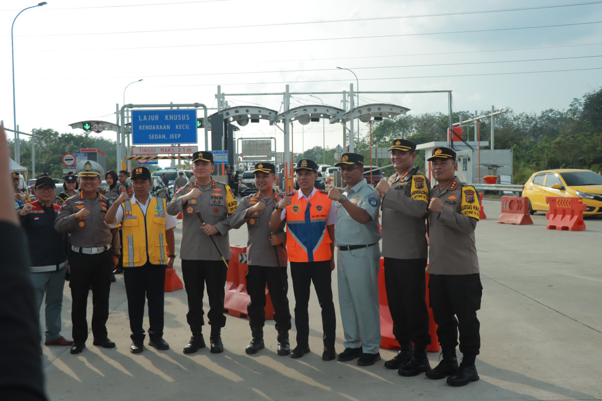 Kapolda Riau dan Rombongan stakeholder di pintu Tol keluar sungai pinang memberi bingkisan berupa setangkai bunga dan makanan snack kepada masyarakat Arus balik dari lebaran.